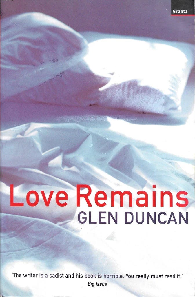 Love Remains, by Glen Duncan is the most authentic and the powerful piece of literature I have ever read. I had never heard of this author before this book and I had never heard of this book until my friend gave it to me some ten years ago. Ever since then I kept an eye out for his name, but nothing ever came up. Trying to find other versions of the book, audio or electronic, has proven futile. It’s rare that something so non mainstream makes it into my hands, and I don’t say this with pride.